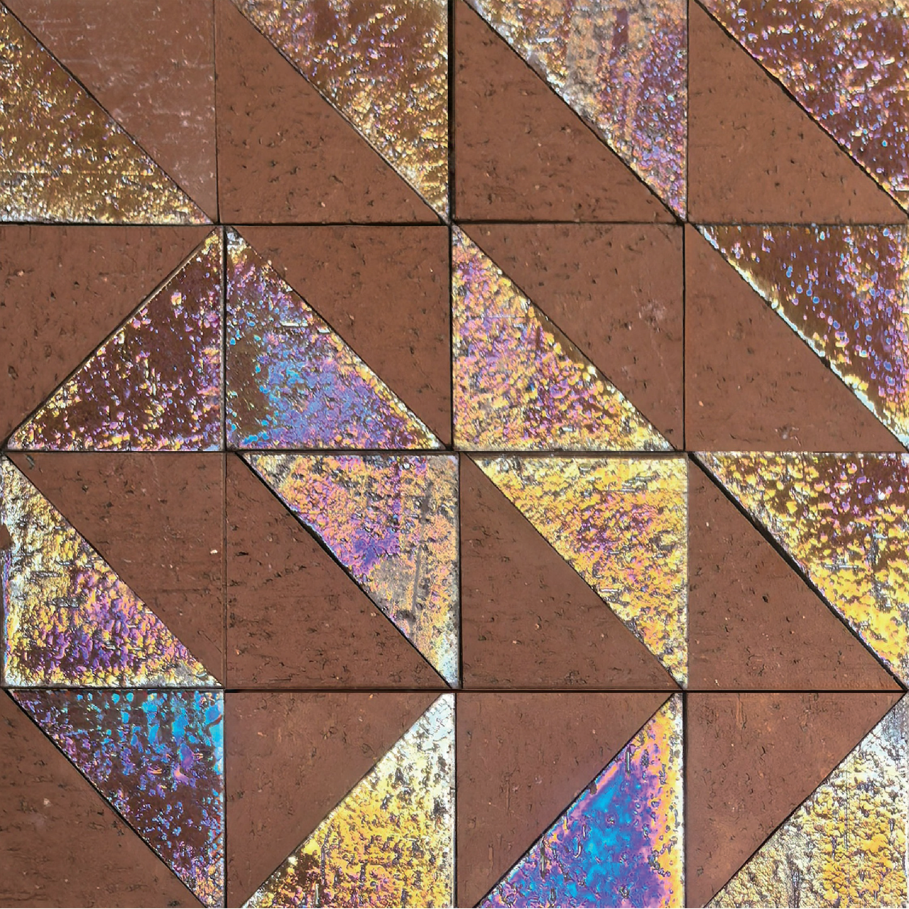 火山岩やいぶし煉瓦などの素朴なベース素材に、角度によって虹彩を放つラスター釉を組み合わせたモザイクタイルです。自然素材に宿る優しさと煌めく華やぎが交差するこのタイルは、感性を刺激するアート空間を演出します。