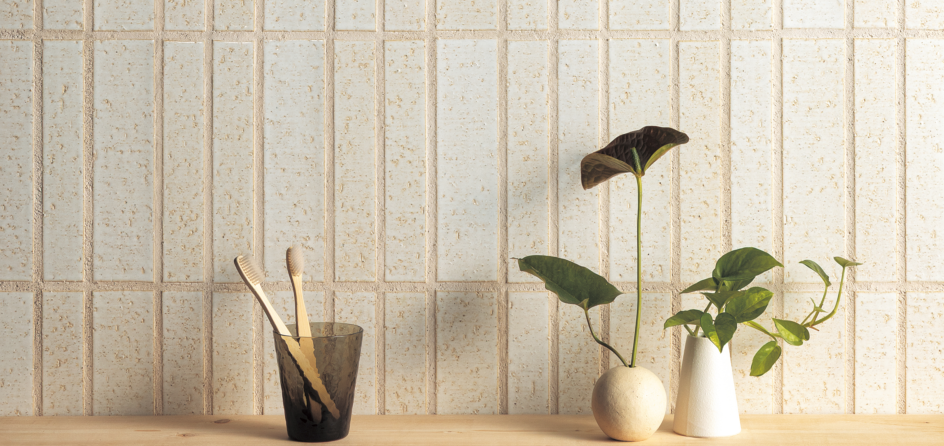 思わず指で触れたくなる、細やかなテクスチュア。それは影さえも柔らかく描き出し、空間に穏やかな表情を創り出します。優しいミルク色の釉薬は、人と自然に寄り添うような温もりを湛え、空間に穏やかな時間を紡ぎ出します。